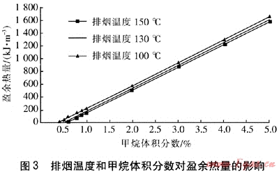 圖3給出了排煙溫度和甲烷體積分?jǐn)?shù)對盈余熱量的影響。從圖3可以看出,在相同甲烷體積分?jǐn)?shù)下排煙溫度越低,盈余熱量越多,主要是因?yàn)樵诩淄轶w積分?jǐn)?shù)一定時,排煙溫度越低,煙氣中有更多的熱量被回收利用。在排煙溫度一定時,甲烷體積分?jǐn)?shù)和盈余熱量呈線性關(guān)系。