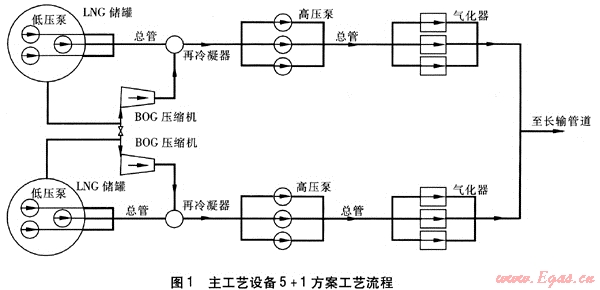 ② 先將BOG壓縮冷卻液化,送入LNG液體總管,然后與其他LNG混合后一起經(jīng)氣化器氣化后再外輸(見(jiàn)圖1)。