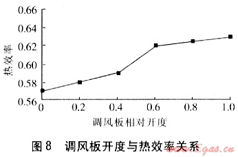 通過增大調(diào)風(fēng)板相對(duì)開度,增大過??諝庀禂?shù),使天然氣完全燃燒,提高熱效率。
