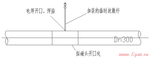 首先仍然是關閉閥1和閥2,通過放散口1.2將管內(nèi)天燃氣放散,放散完成后(火炬點不著),在碰頭開口處用電焊焊上一提前預制好的簡易放散桿,如圖示: