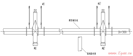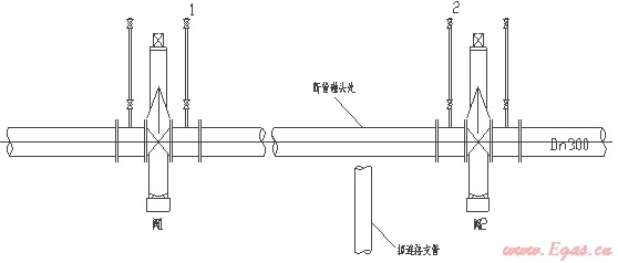 在天然氣中高壓管線上,一般2~3KM(有的甚至長達5KM)方有控制閥門,下以長3KM的DN300鋼管兩閥中間部分需斷管碰頭為例簡單說明:(如下圖示)