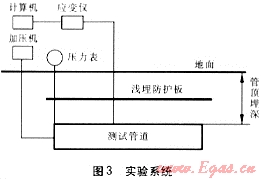 通過實(shí)驗(yàn)分析,可以準(zhǔn)確了解埋地燃?xì)夤艿赖氖芰η闆r,而且,實(shí)驗(yàn)也是驗(yàn)證有限元法計(jì)算結(jié)果準(zhǔn)確性的重要手段。實(shí)驗(yàn)系統(tǒng)見圖3。
