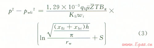 ,地層厚度為ωi,邊界壓力的平方為裂縫尖端壓力平方p2(xfi,yfi,t),井底流壓為水平井井筒內(nèi)壓力pwfi的微型氣藏[7],其流動方式可以看成是氣藏的平面徑向流。根據(jù)氣井產(chǎn)能計算公式,可以把氣體由裂縫向井筒的滲流過程表示為: