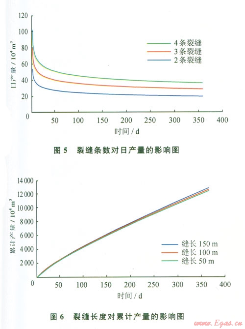 從圖5、6可以看出壓裂水平氣井的產(chǎn)量是隨著裂縫條數(shù)和裂縫長度的增加而增加,但是當(dāng)裂縫條數(shù)增加到一定大小時,壓裂井的產(chǎn)量增加并不明顯。因此并不是裂縫條數(shù)越多、裂縫長度越長,裂縫的產(chǎn)量就越高。因為當(dāng)裂縫的條數(shù)過多、裂縫長度過長時,裂縫間的相互干擾作用就會越嚴(yán)重。