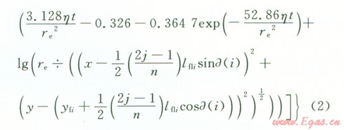 設(shè)第i條裂縫起裂點的坐標(biāo)為(0,yfi),左翼裂縫長度為xfli,右翼裂縫長度為xfri,則據(jù)此可求出第i條裂縫左翼和右翼上第j個點匯的坐標(biāo)(取該小段中點坐標(biāo))。然后把各條裂縫上各個點匯的坐標(biāo)代入式(1),在考慮體積系數(shù)的情況下把它化為直角坐標(biāo)系,并利用貝塞爾函數(shù)的性質(zhì)可得第i條裂縫t時刻在地層中任意一點(x,y)處產(chǎn)生的壓降,最后根據(jù)勢的疊加原理就可求出n條裂縫t時刻在地層任意一點(x,y)處產(chǎn)生的壓降,即