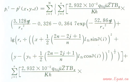 pi為原始地層壓力,MPa;p(x,y,t)為平面上的點(x,y)處t時刻地層的壓力,MPa;p為氣藏平均壓力,MPa;qsc為標(biāo)準(zhǔn)狀況下點匯處氣體的體積流量,l