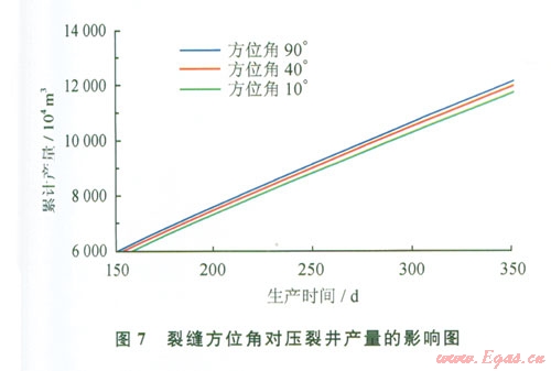 由圖7可以看出隨著裂縫平面與水平井筒夾角的增大,壓裂水平氣井的產(chǎn)量是增加的。這是因為各條裂縫之間的垂直距離變大,使得各條裂縫之間的相互干擾減弱,這就增大了每一條裂縫的有效泄流面積,增加了每條裂縫的產(chǎn)量,促使了壓裂氣井產(chǎn)量的增加。