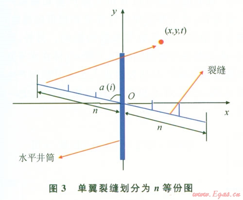 在時間間隔很小的時候,式(1)可以用于實際產(chǎn)量的計算。由于水平井筒不一定沿最小主應(yīng)力方向,所以水平井筒可能和裂縫成任意夾角,以水平井筒的井軸的方向為y軸方向,假設(shè)第i條裂縫與水平井筒的夾角為a (i)(0°≤a≤90°),如圖3將兩翼裂縫都分成n等份[6],每一份可看成一個點匯。此時,就把每一個點匯的坐標(biāo)與裂縫的長度和裂縫方位角a(i)聯(lián)系了起來。