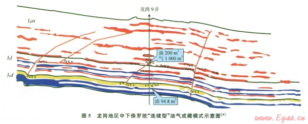 在構(gòu)造較平緩的斜坡帶地區(qū)如龍崗9井或龍崗7井等廣大的區(qū)域,中、下侏羅統(tǒng)的主要烴源巖為涼上段的黑色泥頁(yè)巖以及大安寨段的黑色泥頁(yè)巖、石灰?guī)r,這些烴源巖生成的烴類,首先由附近的小斷裂或(和)裂縫(構(gòu)造縫、層間縫)的疏導(dǎo),向就近的涼高山組或大安寨段中的具有一定儲(chǔ)集條件的砂巖中或富有溶蝕孔隙、裂縫的介殼灰?guī)r中運(yùn)移、聚集。從而形成一些自生自儲(chǔ)型的孤立的巖性或裂縫性油氣藏。