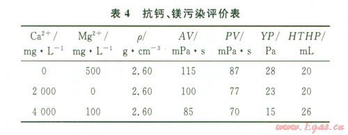 對可應(yīng)用于鹽膏層鉆井液來說,較強的抗鈣、鎂離子污染性能是其必須具備的基本性能。進行了抗鈣、鎂污染評價,試驗結(jié)果見表4。