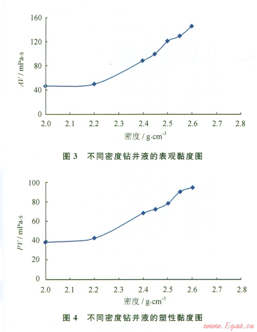 由圖3、4可知,鉆井液的黏度隨著密度的增大而升高,當密度為