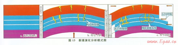 通過(guò)裂縫演化分析認(rèn)識(shí)到(圖13):受膏鹽巖“上拱”影響,西區(qū)構(gòu)造變形處砂巖常發(fā)育高角度構(gòu)造縱張縫。受龍門(mén)山南動(dòng)向應(yīng)力擠壓,是砂巖間的薄層泥巖發(fā)生層間錯(cuò)動(dòng),從而形成近水平層間滑脫縫。構(gòu)造縫+層間縫=網(wǎng)狀裂縫是儲(chǔ)層重點(diǎn)目標(biāo)。