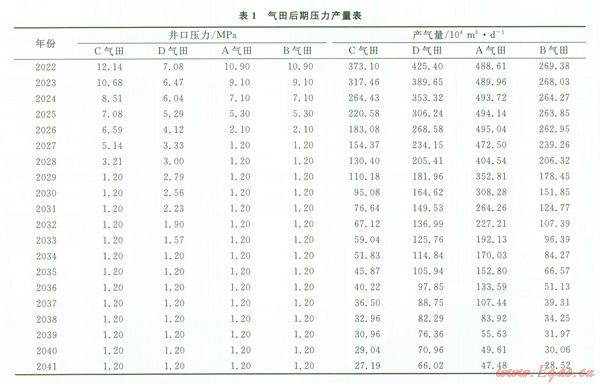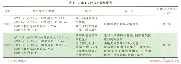 綜上所述,由于各氣區(qū)壓力衰減不一樣,增壓的時間也不一致,若采用天然氣處理廠前集中增壓,則各氣區(qū)進(jìn)天然氣處理廠增壓前必須保持壓力一致,不能充分利用各氣區(qū)的壓能,同時集氣干線管徑需按照增壓前的低壓進(jìn)行計算,增大了管徑。因此,從技術(shù)可行和經(jīng)濟(jì)合理方面綜合考慮,應(yīng)采用各氣區(qū)集中增壓方案。
