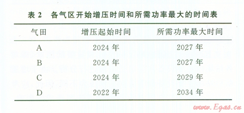 各氣區(qū)后期壓力產(chǎn)量見表1,增壓時間和所需功率最大時間見表2。根據(jù)表l、2對兩個增壓方案進(jìn)行詳細(xì)論證比選。