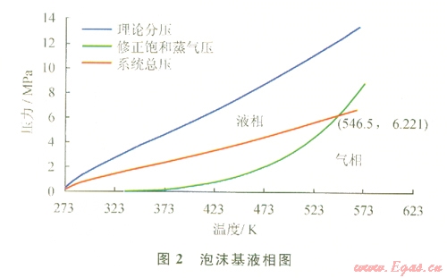 根據(jù)以上的分析可得到泡沫基液相圖(2)。從圖2可知,當(dāng)系統(tǒng)溫度到達(dá)546.5 K,壓力達(dá)到6.221 MPa時(shí),理論分壓線與修正飽和蒸氣壓線相交,即該交點(diǎn)為此系統(tǒng)發(fā)生相變的分界點(diǎn),低于該點(diǎn)的系統(tǒng)溫度和壓力,泡沫流體不會(huì)發(fā)生相變,高于該點(diǎn)的系統(tǒng)溫度和壓力,泡沫流體發(fā)生相變。
