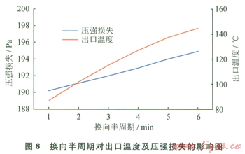 圖8描述的是換向半周期與氧化床壓強(qiáng)損失及出口溫度之間的關(guān)系(乏風(fēng)量為