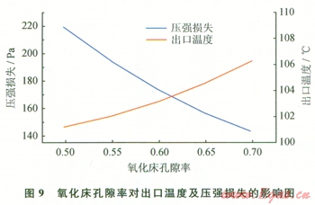 從圖9的氧化床出口溫度變化曲線可以發(fā)現(xiàn),孔隙率的變化對(duì)出口溫度影響不大,孔隙率由0.50增大到0.70時(shí),出口溫度僅僅升高了