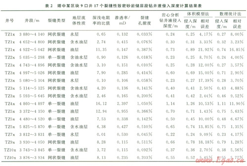 表4是在考慮儲層流體性質時兩種計算模型在不同裂縫系統(tǒng)中的計算對比分析表。同一類型裂縫型地層,從水層→含油水層→含水油層→油層,不管是體積模型還是統(tǒng)計模型,其計算結果均表現(xiàn)出侵入深度是增加的,呈現(xiàn)污染或者損害增加的趨勢。在結合所選擇分析井段使用的鉆井液看,都使用的是水基(鹽水)鉆井液,不難分析出,該區(qū)9口井17個裂縫性致密砂巖儲層段巖石均為親水巖石,若選擇油基鉆井液,鉆井液的侵入深度會大幅度降低,儲層受污染或損害的幾率也會降低。