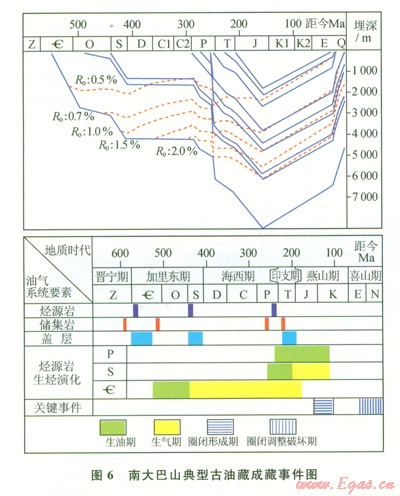 結(jié)合南大巴山的構(gòu)造發(fā)育史,該區(qū)油氣藏成藏過程可以分為3個階段:晚三疊世—早侏羅世開始變形,形成寬緩背斜,形成古油藏;中侏羅世—早白堊世進一步變形,圈閉構(gòu)造定型,部分古油藏裂解,形成油氣藏;古近紀喜山運動對先期構(gòu)造進行了強烈的改造,造成古油氣藏的調(diào)整與破壞。