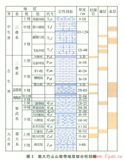 該區(qū)主要經(jīng)歷了2個大的沉積—構(gòu)造演化階段:震旦紀—中三疊世為海相臺地—臺緣沉積—構(gòu)造演化階段;晚三疊世—始新世為陸相碎屑沉積盆地沉積—構(gòu)造演化階段??傮w上缺失上志留統(tǒng)一石炭系,其他層位較為齊全。發(fā)育4套構(gòu)造—地層沉積組合:①基底組合(Pt);②臺地(臺緣)組合(Z—S);③臺地—裂陷邊緣組合(P—T2);④前陸盆地組合(T3x—J)。