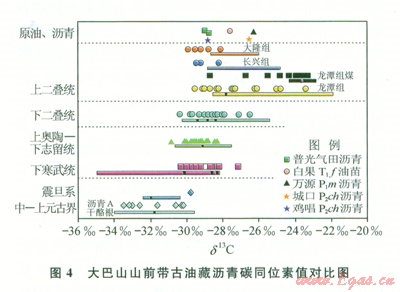 高演化烴源巖的生物標志化合物在油源對比工作中存在很多不確定性,而不同時代烴源巖干酪根和抽提物同位素組成之間有明顯的差異,是油源和氣源對比的一種現(xiàn)實方法。南方海相古生界烴源巖中干酪根碳同位素值變化非常有規(guī)律,從中上元古界到上古生界,干酪根的碳同位素值由輕變重。該區(qū)古油藏瀝青和油苗的碳同位素值分布,均與上二疊統(tǒng)泥巖氯仿瀝青“A”的碳同位素值接近(圖4),表明它們之間具有親緣性。