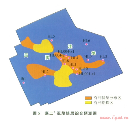 融合多種信息對(duì)嘉二2亞段儲(chǔ)層進(jìn)行綜合預(yù)測(cè)(圖5),嘉二2亞段局限臺(tái)洼環(huán)境下灘相儲(chǔ)層主要分布在較高部位及其斜坡帶,有利儲(chǔ)層地震反射特征表現(xiàn)為強(qiáng)振幅區(qū)域中相對(duì)較弱振幅的暗點(diǎn)反射。儲(chǔ)層平面分布呈現(xiàn)較強(qiáng)的非均質(zhì)特征,HL2井西北及東南斜坡區(qū)、HL8井高部位、南部及東部斜坡、HL5井西部為有利儲(chǔ)層發(fā)育區(qū),其中HL2井東南高部位及其斜坡、HL5井西高點(diǎn)為研究區(qū)下一步最有利勘探區(qū),HL2井西北斜坡、HL5井南斜坡和HL001-Xl井東部地區(qū)為較有利勘探區(qū)。