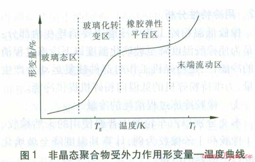 通常所說的橡膠是指玻璃化溫度(Tg)低于室溫的非晶態(tài)聚合物。橡膠和塑料就是按照玻璃化溫度是在室溫以上還是在室溫以下進行區(qū)分的。玻璃化溫度在室溫以下的聚合物稱為橡膠,玻璃化溫度在室溫以上的聚合物稱為塑料。玻璃化溫度是聚合物的特征溫度之一,非晶態(tài)聚合物在玻璃化溫度附近發(fā)生玻璃態(tài)一橡膠態(tài)轉(zhuǎn)變。圖l為非晶態(tài)聚合物受外力作用產(chǎn)生的形變量一溫度變化曲線。對于同一種聚合物,當其溫度大于Tg時,聚合物處于橡膠態(tài);當溫度小于Tg時,聚合物處于玻璃態(tài)。處于橡膠態(tài)的聚合物當有外力作用時發(fā)生大的形變,外力撤去后形變可以恢復,也就是我們通常所說的橡膠彈性。在一定溫度范圍內(nèi)(橡膠彈性平臺區(qū)),當溫度降低時,處于橡膠態(tài)的聚合物在外力作用下的形變量隨溫度變化很小。隨著溫度的下降,在玻璃化溫度附近,當溫度發(fā)生很小變化時,聚合物受外力產(chǎn)生的形變量隨溫度變化出現(xiàn)明顯變化,表現(xiàn)為隨溫度的降低形變量顯著減小。當溫度繼續(xù)降低,聚合物進入玻璃態(tài),此時聚合物已完成了橡膠態(tài)一玻璃態(tài)之間的轉(zhuǎn)變,在外力作用下聚合物的形變量受溫度變化影響很小,形變量也很小。廢舊橡膠低溫粉碎就是通過冷凍使橡膠溫度降至玻璃化溫度以下,使其進入玻璃態(tài),低溫下橡膠分子鏈段不能運動,表現(xiàn)出膪|生,從而易于粉碎。