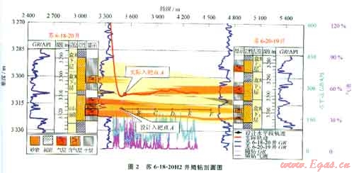 在鉆遇上部砂體頂部時井斜一般在80°左右,需要穩(wěn)斜基本查明上部氣層情況,如果上部砂層與參照井一致,可繼續(xù)快速下探按原設(shè)計入靶,而不至于造成過長的無效靶前距。典型井如蘇6-18-20H2井,在鉆遇目標(biāo)砂層組上部單砂體時,砂體厚度變厚,由干層變?yōu)?/span>氣層,后調(diào)整入靶位置在上部單砂體入靶(圖2)。