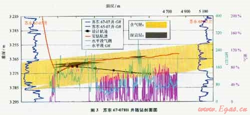 由于蘇里格氣田復(fù)雜的砂體疊置關(guān)系,常見以交錯單砂體所引起的“假構(gòu)造”,因此,水平段地質(zhì)導(dǎo)向關(guān)鍵是對水平井部署區(qū)域目標(biāo)層“真假構(gòu)造”的識別。但無論是同一砂體真構(gòu)造,還是由不同砂體形成的假構(gòu)造,水平段施工都不應(yīng)過分注重設(shè)計構(gòu)造趨勢而忽視巖性變化,應(yīng)以“先追蹤砂體、后參考構(gòu)造”的原則靈活調(diào)整導(dǎo)向。以蘇里格氣田中區(qū)水平井施工為例,采取該導(dǎo)向方法取得了顯著效果,全年有5口井采取追蹤砂體導(dǎo)向而偏離設(shè)計井眼軌跡獲得成功,砂層鉆遇率明顯提高。典型井如蘇東67-07H1井,水平段末端與設(shè)計井眼軌跡偏差達(dá)11m,而砂層鉆遇率達(dá)到84.4%(圖3)。