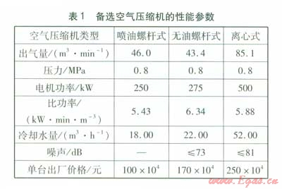 根據(jù)上述要求,可綜合選用噴油螺桿式空氣壓縮機(jī)、無油螺桿式空氣壓縮機(jī)、離心式空氣壓縮機(jī)。參考廠家的樣本資料,備選空氣壓縮機(jī)的性能參數(shù)見表l。