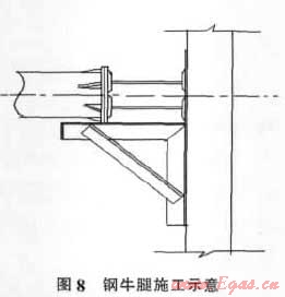 鋼牛腿作為鋼圍檁及支撐桿件重要的豎向力承受構(gòu)件,應(yīng)在支撐及鋼圍檁安裝前完成施工及安裝工作,鋼牛腿用3道角鋼焊接而成,為便于鋼圍檁、支撐安裝及支撐活動(dòng)端預(yù)應(yīng)力施加,在3道角鋼頂焊接了一塊800mm×900mm的鋼板作為施工平臺(tái),鋼牛腿及圍檁施工前應(yīng)將相應(yīng)位置的鋼樁保護(hù)層鑿除,露出鋼管壁,用焊接方式進(jìn)行鋼牛腿與鋼樁的連接,有關(guān)焊接方法及工藝由施工單位通過(guò)現(xiàn)場(chǎng)試驗(yàn)后提出具體的焊接施工圖,并由設(shè)計(jì)單位認(rèn)可后實(shí)施。鋼牛腿施工見(jiàn)圖8。