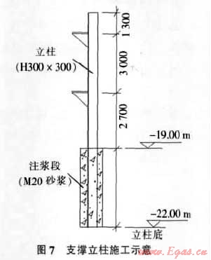 在封底旋噴樁施工完成后進(jìn)行支撐立柱的施工。立柱采用300mm×300mm型鋼制作,引孔直徑500mm,底部-19~-22m段灌注M20水泥砂漿。支撐立柱施工見(jiàn)圖7。