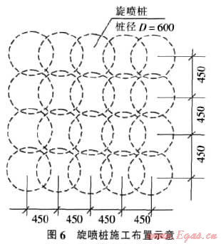 (2)旋噴樁行距450mm,列距450mm,孔位偏差一般不宜大于50mm,孔斜≤1.5°。