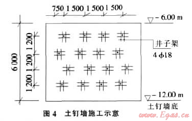 (2)土釘成孔直徑120mm,土釘主筋選用4準(zhǔn)18mm,鋼筋間距為0.4m,釘孔內(nèi)灌注M15水泥砂漿或水泥漿。