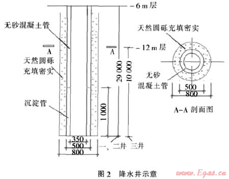 (2)坑外-6m平臺(tái)降水井(一、二井)的鑿井深度29.0m,井頂標(biāo)高-6.0m,井底標(biāo)高-35.00m,井徑均為800mm,采用無(wú)砂混凝土管,直徑為500mm,其孔隙率不小于15%;降水井下端設(shè)1.0m長(zhǎng)的沉淀管。為防止涌砂產(chǎn)生,在濾水管外包扎兩層60~80目濾網(wǎng),井管外采用天然圓礫填料,圓礫的粒徑為3~5mm。