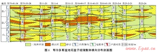 ②儲集體物性與連續(xù)性橫向變化。這是由于沉積環(huán)境、成巖作用與后生改造作用強度的橫向變化,使儲集體在總體連續(xù)且大型化發(fā)育的背景上,其內部存在儲集空間與物性的橫向規(guī)模變化,因而在似層狀分布背景上,形成了由一系列孔、滲和孔喉結構相對較好的儲滲單元或縫洞單元組成的儲集體群,單個儲滲單元和縫洞單元的規(guī)模不大,且尺度多變,但形成的儲集體群的規(guī)模相當大。如鄂爾多斯盆地蘇里格氣田的砂巖儲集層,主要由眾多致密砂體和常規(guī)砂體組成(見圖6)。