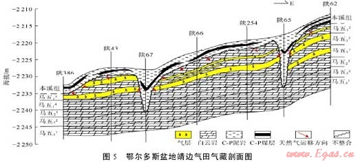 生儲蓋組合大型化發(fā)育是指烴源巖、儲集層與蓋層在三維空間通過緊密的面狀接觸,或通過各種通道的連接而形成的生、儲、蓋組合體大規(guī)模分布。由于烴源巖與儲集體群的大型化發(fā)育,因而組合的規(guī)模也呈大型化分布。中國陸上大型含油氣盆地與中低豐度油氣資源大型化成藏有關的生儲蓋組合類型主要有4種(見圖4):①廣覆式組合,即烴源巖在下,儲集體在上,二者以席狀方式大面積緊密接觸,規(guī)模相當大。這類組合以鄂爾多斯盆地石炭-二疊系海陸過渡相煤系碎屑巖組合最為典型,儲集體群整體覆蓋于烴源灶之上,這為天然氣從烴源巖排出以后,整體規(guī)模進入儲集體群并大型化成藏創(chuàng)造了極為有利的條件。②三明治式組合,即烴源巖與儲集體以間互方式緊密接觸,大規(guī)模分布。這類組合以四川盆地上三疊統(tǒng)須家河組最典型,須一、三、五段為主要氣源巖,而須二、四、六段是主要儲集層,二者間互發(fā)育,分布面積達11.3×104km2。氣源巖排出的烴類可規(guī)模進入鄰近儲集體并大范圍成藏。③轉接式組合,是指烴源灶與儲集體并不直接接觸,而是通過呈網(wǎng)狀分布的斷層和面狀分布的不整合與儲集體群相聯(lián)系以保證油氣發(fā)生規(guī)模運聚的一類生儲蓋組合。這類組合以塔里木盆地塔中和塔北隆起斜坡區(qū)的奧陶系一間房組、良里塔格組和鷹山組為代表。④倒灌式組合,是指烴源巖以“鍋蓋”方式,覆蓋于儲集體之上,上覆烴源巖形成的油氣以倒灌方式進入下伏儲集體并大型化成藏。這也是一類規(guī)模相當大的儲蓋組合,以鄂爾多斯盆地中部奧陶系馬家溝組為代表(見圖5),石炭-二疊系煤系烴源灶直接覆蓋于馬家溝組風化殼儲集層之上,天然氣呈倒灌方式進入下伏儲集體成藏。目前僅靖邊氣田就已發(fā)現(xiàn)氣藏近160個,控制含氣面積約1.0×104km2,探明天然氣地質儲量4337×108m3、基本探明地質儲量330×108m3,控制天然氣儲量2087×108m3,三級地質儲量達6754×108m3。
