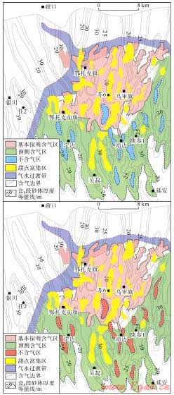 大面積成藏組合是指受連續(xù)性較好、油氣源供給充足的烴源灶控制的一類成藏組合,這類組合主要分布于鄂爾多斯盆地石炭-二疊系的海陸過渡相砂巖層系中。此外,一些鄰近主力氣源灶的碎屑巖層系,也有發(fā)育這類組合的可能性,如準噶爾盆地環(huán)瑪納斯湖生烴中心的二疊系佳木河組、夏子街組和烏爾禾組,鄂爾多斯盆地靠近烴源灶的太原組,四川盆地鄰近川西主力氣源灶的上三疊統(tǒng)須家河組,以及須一、三、五段主力氣源巖層系內部的砂巖體等。