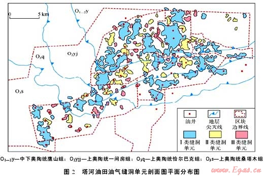 大型化成藏包含兩方面含義:①成藏要素的大型化發(fā)育與平面上的規(guī)模變化。從成藏要素看,烴源灶、儲集體以及生儲蓋組合的分布面積至少在數(shù)千甚至上萬平方千米以上,如鄂爾多斯盆地上古生界石炭系煤系烴源巖與二疊系碎屑巖儲集層,分布面積都超過20×104km2。從成藏要素的規(guī)模變化看,烴源灶、儲集體的平面分布存在強烈的非均勻性,致使形成的地層和巖性圈閉在橫向上具有多變性,呈集群式分布。如塔里木盆地輪南—塔河奧陶系碳酸鹽巖縫洞型大油氣田,可以劃分出數(shù)百個縫洞單元,每個縫洞單元都是一個相對獨立的油氣聚集單元,形成的油氣藏呈集群式分布(見圖2)。②成藏分布樣式上表現(xiàn)為薄餅式或集群式成藏,這是中低豐度油氣藏群區(qū)別于常規(guī)高豐度油氣藏(田)和非常規(guī)連續(xù)型油氣聚集最典型的特征。