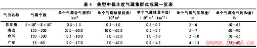 集群式成藏是指油氣在一系列呈集群式發(fā)育的地層、巖性圈閉中聚集而形成的一類成藏現(xiàn)象。這是由于在克拉通盆地平緩臺地區(qū)的碳酸鹽巖層系、陸內坳陷海陸過渡相與陸相層系以及前陸盆地緩翼廣大斜坡區(qū)的陸相沉積層系中,因建設性成巖和后生成巖改造作用,或由于原始沉積物源區(qū)巖性多變、水動力能量多變等,導致儲集層非均質性強,形成眾多呈獨立或半獨立狀分布的聚集體,就像玻璃板中眾多大小不一的氣泡,單體規(guī)模不大,但儲集體眾多則形成了規(guī)模巨大的集合體(見表4)。當油氣充注后,不僅形成的油氣藏群規(guī)模很大,而且這些規(guī)模巨大的油氣藏群對封蓋條件的要求也不高,只要有遮擋條件(多數(shù)小于幾個兆帕)就可規(guī)模成藏,其中豐度較高的油氣藏(俗稱“甜點”)是油氣勘探的重點。如鄂爾多斯盆地蘇里格氣田盒8段心灘砂體,由于巖性、物性橫向變化劇烈,致使大氣田由成千上萬個單體規(guī)模較小的氣藏群構成,常規(guī)小型巖性氣藏之間連續(xù)或不連續(xù)分布著含氣飽和度較低的致密氣層、干層或水層(蘇里格西區(qū)低部位),總體表現(xiàn)為非常規(guī)氣與常規(guī)氣的混合共生。根據(jù)對蘇里格氣田的解剖,氣田的含氣面積接近3.3×104km2,依據(jù)砂體形態(tài)可以確定的氣藏數(shù)量約5×104~8×104個,單個氣藏氣柱高度2~6m、儲量規(guī)模一般在3000×104~10000×104m3,整個氣田的平均儲量豐度約0.7×108m3/km2。致密砂巖普遍含氣,含氣飽和度不高但連續(xù)分布。