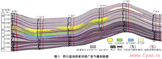 大范圍成藏組合是指“甜點”富集油氣,而成藏范圍很廣的一類成藏組合。這類組合主要形成于三明治式組合和倒灌式組合之中,以四川盆地川中地區(qū)須家河組和鄂爾多斯盆地中部奧陶系馬家溝組巖溶風化殼代表??碧浇沂?,單一有經(jīng)濟性的油氣聚集范圍有限,但平面上由數(shù)十乃至上百個油氣藏散布于廣闊的區(qū)域內,油氣藏之間多被水區(qū)、致密區(qū)構成的“天窗”阻隔,具有斑塊狀成藏特征。研究表明,導致成藏分布不連續(xù)的原因有二:①烴源灶分布不均勻、供烴總量不充分,近源儲集體優(yōu)先成藏;②儲集體的連續(xù)性較差,導致形成的油氣藏在很大的范圍內呈星羅棋布式分布。如四川盆地須家河組氣藏(見圖8),由于須一、三、五段煤系源巖的連續(xù)性平面變化較大,一些區(qū)域煤系烴源巖明顯減薄甚至缺失,致使與之接觸的須二、四、六段儲集層中含氣飽和度與資源豐度平面上有明顯變化,煤系烴源巖減薄區(qū)(俗稱“天窗區(qū)”)成藏機率低,而優(yōu)質烴源巖和有效儲集層疊置區(qū)是天然氣的主要富集區(qū),形成的氣藏儲量豐度與含氣飽和度相對較高。