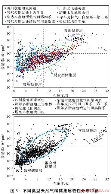 根據(jù)對已發(fā)現(xiàn)油氣藏地質特征的分析,中國油氣資源目前可以劃分為3大類:①常規(guī)油氣資源,以已發(fā)現(xiàn)的高豐度油氣田(藏)為代表;②非常規(guī)油氣資源,包括部分致密砂巖氣、致密油、煤層氣和頁巖氣等,也可稱之為連續(xù)型油氣聚集;③混合型油氣資源,由常規(guī)和非常規(guī)油氣資源混合而成,在地質含義上等同于中低豐度油氣藏群?;旌闲陀蜌赓Y源有3方面特點:①儲集體物性和儲集層結構特征處于常規(guī)儲集層和非常規(guī)儲集層的過渡區(qū),具明顯的混合性(見圖3)。②油氣成藏存在兩種機制,既有常規(guī)油氣藏主要通過達西流動,以體積流方式成藏;也有非常規(guī)油氣(主要是致密砂巖油氣),主要通過非達西流動,以擴散流方式成藏,成藏機制具有雙重性。③資源構成具有二元性。若以儲集層地下滲透率小于0.1×103μm2、地面滲透率小于1×103μm2為標準,統(tǒng)計中國陸上已發(fā)現(xiàn)的中低豐度(亦稱低滲透)天然氣儲量,常規(guī)氣約占35%,非常規(guī)氣約占65%。