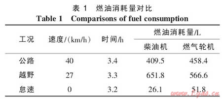 AGT-1500燃?xì)廨啓C(jī)具有回?zé)嵫b置。按照車輛使用性質(zhì),美國(guó)陸軍分別在公路、越野、怠速3種不同工況下對(duì)柴油機(jī)和燃?xì)廨啓C(jī)進(jìn)行實(shí)際試驗(yàn)。表1為該實(shí)驗(yàn)的部分?jǐn)?shù)據(jù)。