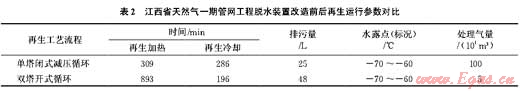 干燥器基本參數(shù)為:單塔分子篩質(zhì)量450kg,設(shè)計(jì)處理量10000m3/h,設(shè)計(jì)吸附周期16h。為量化分析工藝改造前后生產(chǎn)參數(shù)的變化(表2),依據(jù)文獻(xiàn)[4],將國家規(guī)定標(biāo)況下壓縮天然氣的水露點(diǎn)-60℃換算成工況(3.6MPa)下的水露點(diǎn)為-30℃。