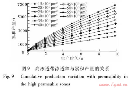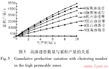 在建立的數(shù)值模型中嵌入高滲透帶,改變高滲透帶的特征參數(shù),通過數(shù)值模擬分析高滲透帶對累積產(chǎn)量和采出程度的影響。