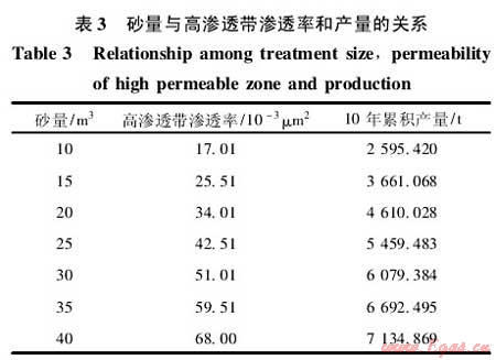 從表3知,隨著加砂規(guī)模的增大,高滲透帶的滲透率和壓裂后的產(chǎn)量逐漸增大,當(dāng)單簇高滲透帶加砂規(guī)模大于25m3時,累積產(chǎn)量增加趨勢減緩。由圖7和圖8數(shù)值模擬結(jié)果知本井優(yōu)化的高滲透帶滲透率上限為40×10-3μm2,對應(yīng)的砂量為20~25m3。綜合考慮施工風(fēng)險,建議本井高滲透帶滲透率取30×10-3μm2左右,每簇高滲透帶的砂量為15~20m3。