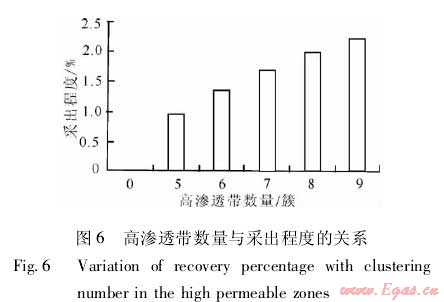 從圖5可見,當(dāng)高滲透帶數(shù)量為0,即儲層不壓裂時,此時井筒全靠儲層基質(zhì)滲流,10年時間的累積產(chǎn)量僅1t,基本無產(chǎn)能;高滲透帶數(shù)量為7簇時,累積產(chǎn)量4297t,采出程度1.72%;8簇時,累積產(chǎn)量4993.7t,采出程度2.0%;9簇時,累積產(chǎn)量5476.0t,采出程度2.19%(圖6)。