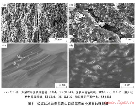 利用掃描電鏡和場(chǎng)發(fā)射掃描電鏡二次電子成像技術(shù)對(duì)松遼盆地主要生油層白堊系青山口組泥頁巖中發(fā)育的孔隙和微裂縫進(jìn)行了系統(tǒng)的成像觀察,發(fā)現(xiàn)該套頁巖中主要發(fā)育了5種類型孔隙即基質(zhì)晶間孔、有機(jī)質(zhì)孔、溶蝕孔、粒間孔、晶內(nèi)孔及微米—亞微米級(jí)(納米級(jí))微裂縫,微裂縫包括充填縫、溶蝕縫及層間縫。各種類型孔隙與微裂縫伴生發(fā)育,并可能彼此連通。這種復(fù)雜微裂縫網(wǎng)絡(luò)-孔隙系統(tǒng)的存在為油氣從烴源巖向外排驅(qū)提供了有效通道,同時(shí)也為滯留在泥頁巖中的部分油氣提供了有效的儲(chǔ)集空間。該套地層中各類型孔隙尺寸為納米—微米級(jí),可能主要受頁巖基質(zhì)的微觀孔隙結(jié)構(gòu)、礦物組成、有機(jī)質(zhì)類型以及有機(jī)質(zhì)的熱演化程度等因素的影響。