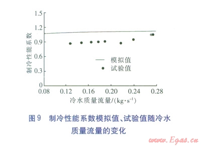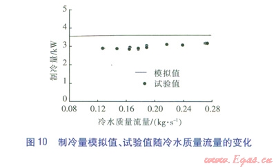 其他參數(shù)不變,制冷性能系數(shù)、制冷量模擬值、試驗值隨冷水質(zhì)量流量的變化分別見圖9、10。由圖9、10可知,制冷性能系數(shù)、制冷量的模擬值均隨冷水質(zhì)量流量的增大而增加,但上升的趨勢相當(dāng)平緩,且試驗值低于模擬值。