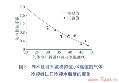其他參數(shù)不變,制冷性能系數(shù)、制冷量模擬值、試驗值隨氣體冷卻器進口冷卻水溫度的變化分別見圖3、4。由圖3、4可知,隨著氣體冷卻器進口冷卻水溫度的升高,制冷性能系數(shù)、制冷量模擬值、試驗值均呈下降趨勢。這說明降低氣體冷卻器進口冷卻水溫度,對提高制冷量是有利的。